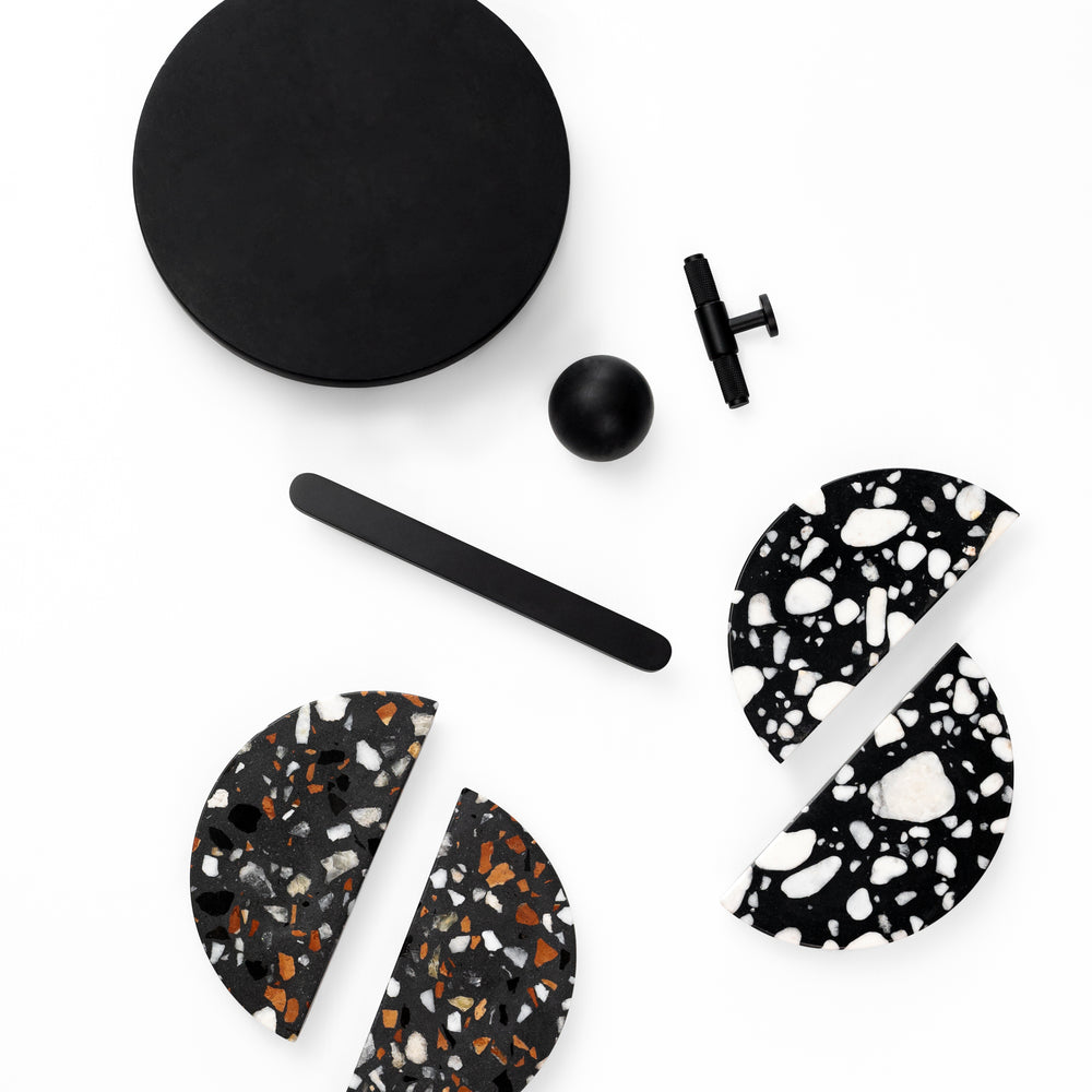 Revamp your cabinetry with our Hemi Pebble Handle, showcasing a distinctive design that elevates the allure of your kitchen, bath, or laundry space. Crafted from rich black marble with accents of white pebble colouring, these semi-circle handles add a touch of sophistication, effortlessly refreshing any area or providing a stylish upgrade to a dated chest of drawers. The striking contrast between the black marble and the white pebble elements brings a unique and eye-catching aesthetic to your deco